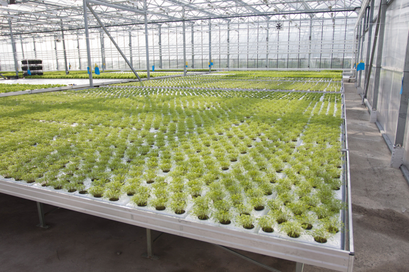 The movable bench structure reduces fixed aisles, allowing growers to maximize greenhouse growing space.